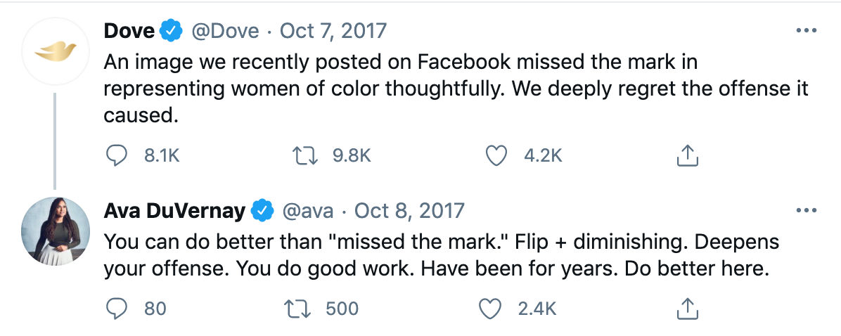 Dove's responses in 2011 and 2017 illustrate the necessity of acknowledging the problem and overcorrecting. It also demonstrates the strength of their purpose-driven brand. Ava DuVernay's feedback included an acknowledgement of Dove's good work towards inclusion for over a decade. Dove's Campaign for Real Beauty started in 2004 and built trust for the brand. But advocates expected more, and Dove delivered with its 2019 #ShowUs campaign.
