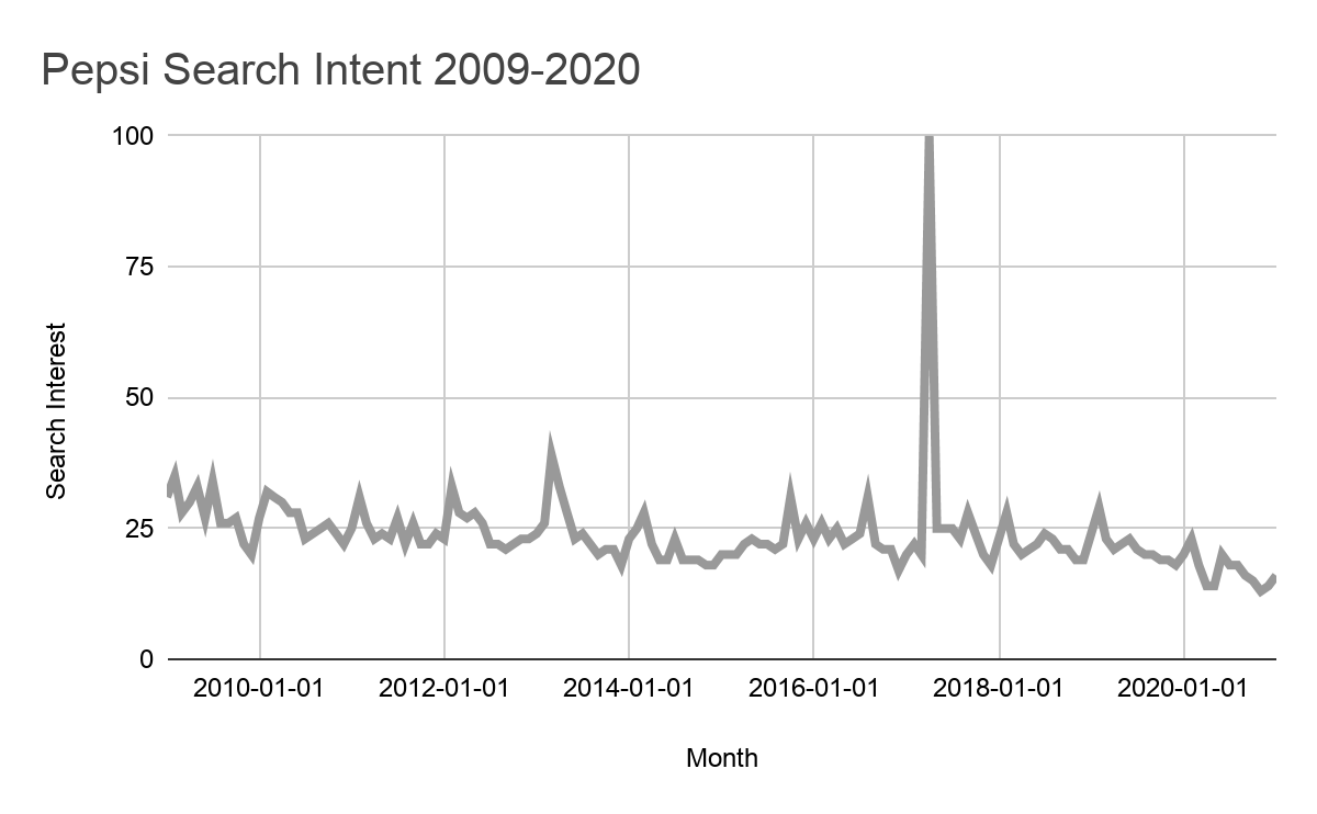 The long-term impact is visible in the interest in the brand. When looking at Google search intent since 2009, not only can you see that April 2017 was by far the most searched time for the brand, but you can also see a nearly 20% drop in average search interest for Pepsi after the crisis.